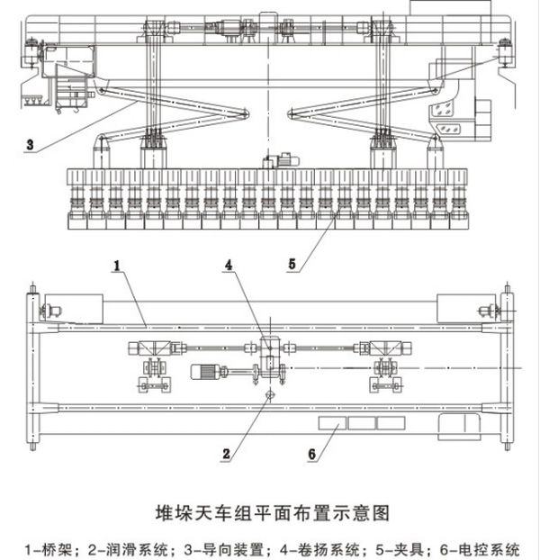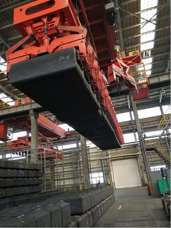 本產(chǎn)品通過自動(dòng)夾鉗,每次可夾取21塊陽(yáng)極碳?jí)K,***高可堆成8層。橋架下面裝有工字鋼,工字鋼上裝有5t電動(dòng)葫蘆,該葫蘆沿工字鋼運(yùn)行,可通過單塊自動(dòng)碳?jí)K夾鉗夾取碳?jí)K,還可在車間吊運(yùn)零星雜物。運(yùn)行和起升全部采用變頻調(diào)速,全部操作均可在操縱室內(nèi)完成。采用機(jī)械重力式自動(dòng)夾取代替氣動(dòng)方式夾取碳?jí)K,為制造廠和用戶大大節(jié)約了成本。