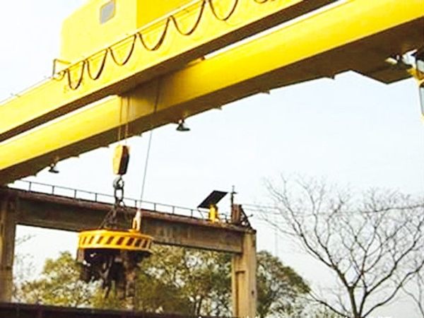 電磁橋式起重機的基本構(gòu)造與吊鉤橋式起重機相同,不同的是吊鉤上掛1個直流起重電磁吸盤,用來吊運具有導磁性的黑色金屬及其制品。通過裝在司機室內(nèi)的可控硅直流箱將交流電源轉(zhuǎn)換為直流電源,然后再通過設在小車上的專用電纜卷筒,將直流電源用電纜送到電磁吸盤上。