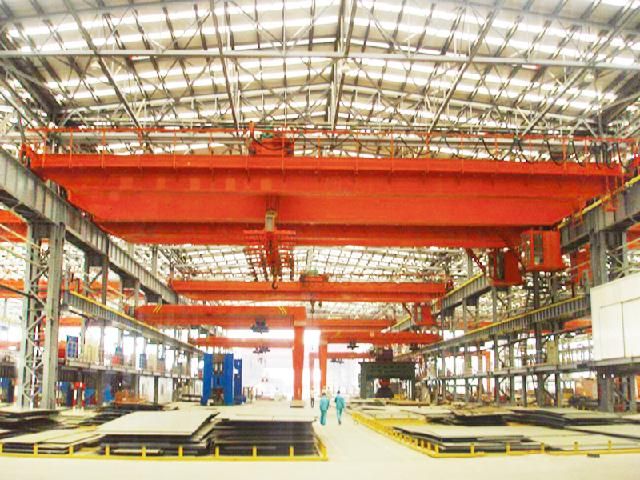 本起重機采用掛梁吊運長件鋼坯、板材、棒材、盤圓等物品,配置電磁吸盤或夾鉗或特殊群鉤進行吊裝,主要由箱形橋架、起重小車、大車運行機構(gòu)、司機室和電氣控制系統(tǒng)組成,配有停電保磁系統(tǒng)。起升機構(gòu)多采用單電機、雙減速器、雙卷筒布置,呈雙吊點形式。掛梁布置形式分垂直于主梁或平行于主梁兩種。其余形式與QD型起重機相同。