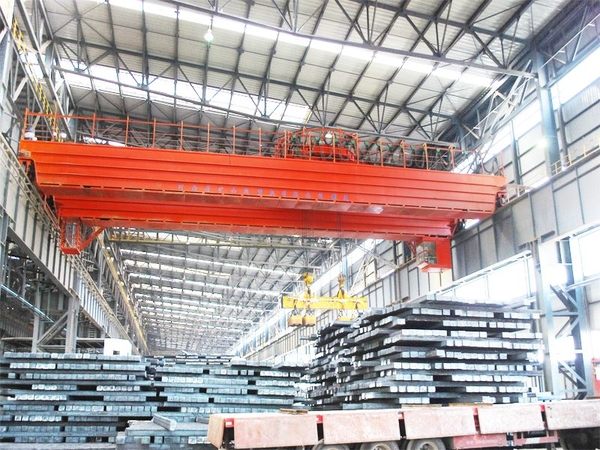 用于搬運長件板坯、棒材等黑色金屬?;剞D(zhuǎn)通過兩種形式實現(xiàn),一種形式為掛梁回轉(zhuǎn),即掛梁為雙層結(jié)構(gòu),上層掛梁通過滑輪組與鋼絲繩纏繞,下層掛梁配有多臺電磁吸盤或夾鉗,可隨驅(qū)動機構(gòu)回轉(zhuǎn)一定角度。另一種形式為小車回轉(zhuǎn),即小車為雙層結(jié)構(gòu),上層小車布置有起升機構(gòu),下層小車為運行小車,上面鋪設(shè)有環(huán)形軌道,上層小車可沿環(huán)形軌道回轉(zhuǎn)。